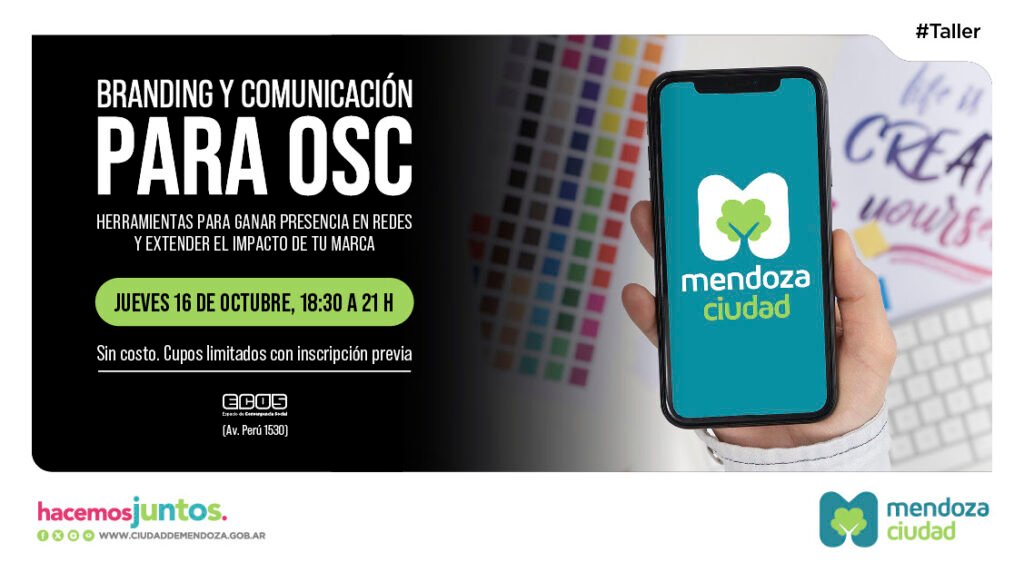 La Ciudad de Mendoza, a través del área de Vinculación Comunitaria y el Espacio de Convergencia Social (ECoS), invita a las Organizaciones de la Sociedad Civil (OSC) a participar del Taller de Branding y Comunicación Digital, una capacitación gratuita orientada a fortalecer su identidad institucional y su proyección en el ámbito digital.