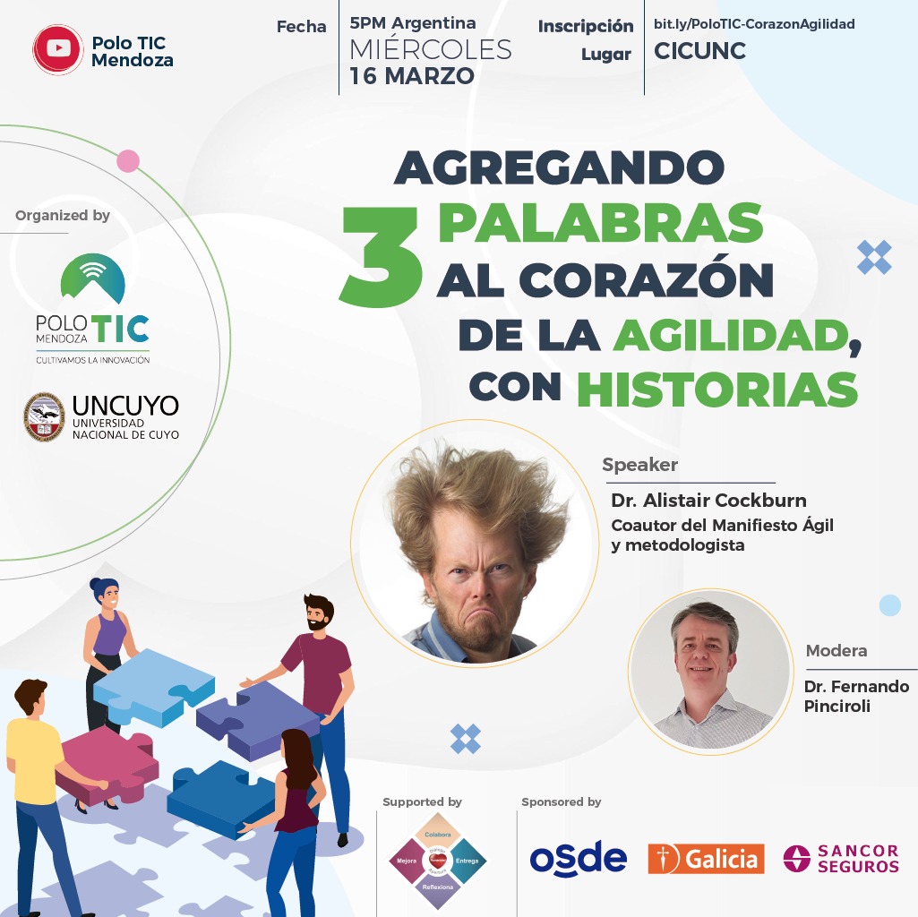 Polo TIC Mendoza junto a la Universidad Nacional de Cuyo invitan a una charla junto a Alistair Cockburn, coautor del Manifiesto Agile, en la que se hablará sobre el Corazón de la Agilidad.