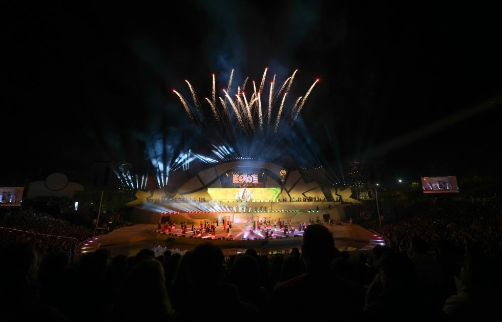 La puesta en escena incluyó sistemas de iluminación digital programada, pantallas de gran formato y tecnología de proyección que permitieron acompañar la coreografía de cientos de artistas en escena.